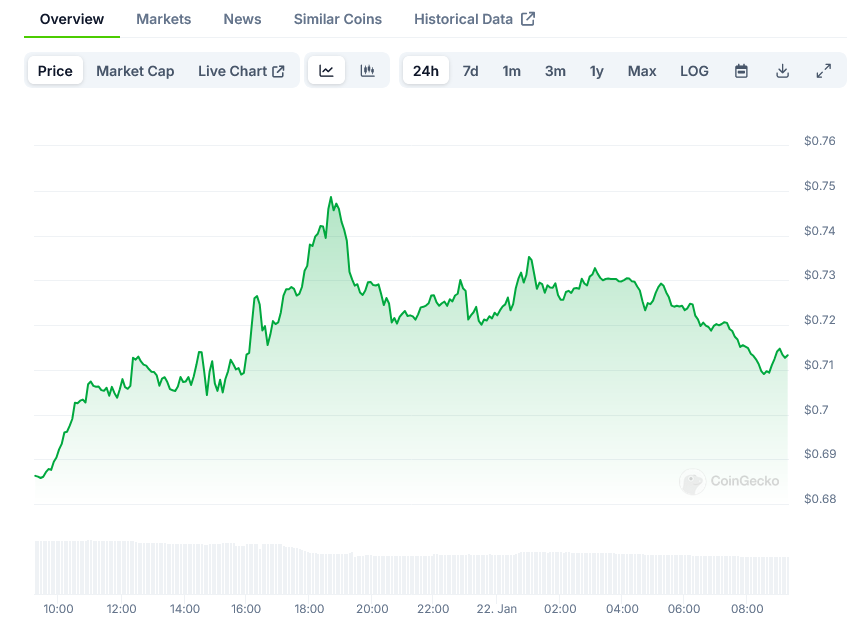 The descending triangle pattern, a technical formation closely monitored by traders, has formed over recent weeks. This pattern typically signals a period of consolidation before a potential breakout. The upper resistance line of the triangle sits at $0.78, while the lower support level rests at $0.6890.