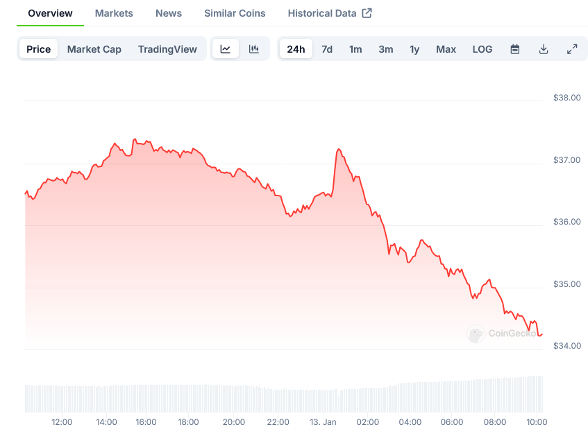 Avalanche’s native token AVAX is experiencing increased selling pressure as technical indicators point to challenging market conditions. Currently trading at $36.72, AVAX/USDT has established a pattern of lower highs and lower lows, suggesting a continuation of the prevailing bearish trend.