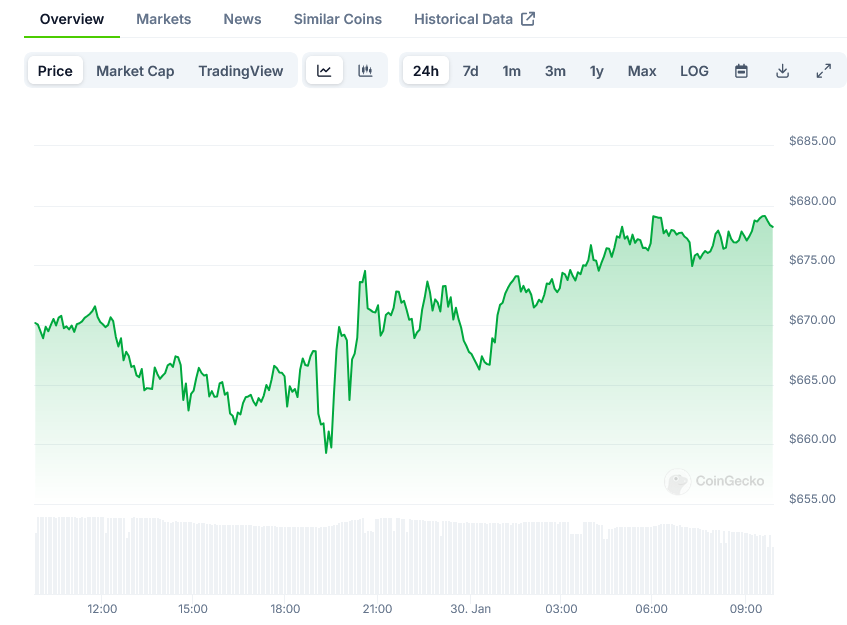 The immediate price action shows multiple technical levels of interest, with $689.47 serving as a critical resistance point. A successful breach of this level could open the path toward the $720.98 target, as indicated by technical analysis patterns and Bollinger Band configurations.