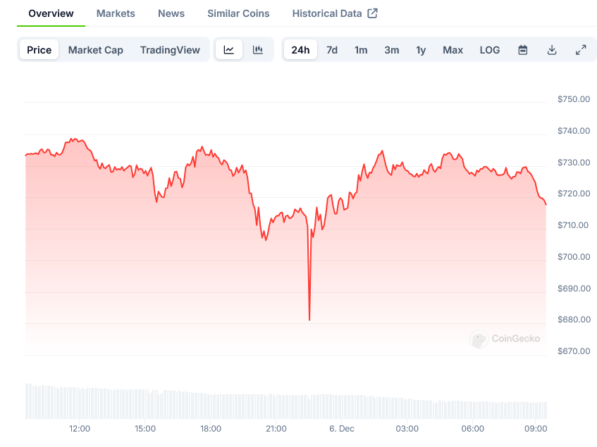 The correction from the $794 peak brought the price to a low of $688, where buyers stepped in to defend the support level. The subsequent bounce has established a consolidation pattern near the $725 zone, with traders closely monitoring this area for potential breakout signals.