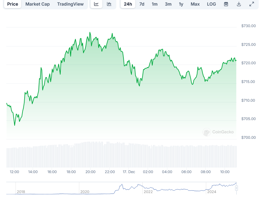 BNB, the native token of the Binance exchange, is currently testing a crucial support level at $700 after reaching an all-time high of $793 in early December 2024. The price movement comes amid broader market activity that has seen Bitcoin touch new heights at $106,533.