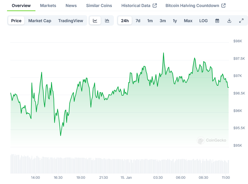At press time, Bitcoin trades at $96,424, showing a 4.9% increase over the past 24 hours. The most recent price action indicates continued buying pressure above the established support levels.