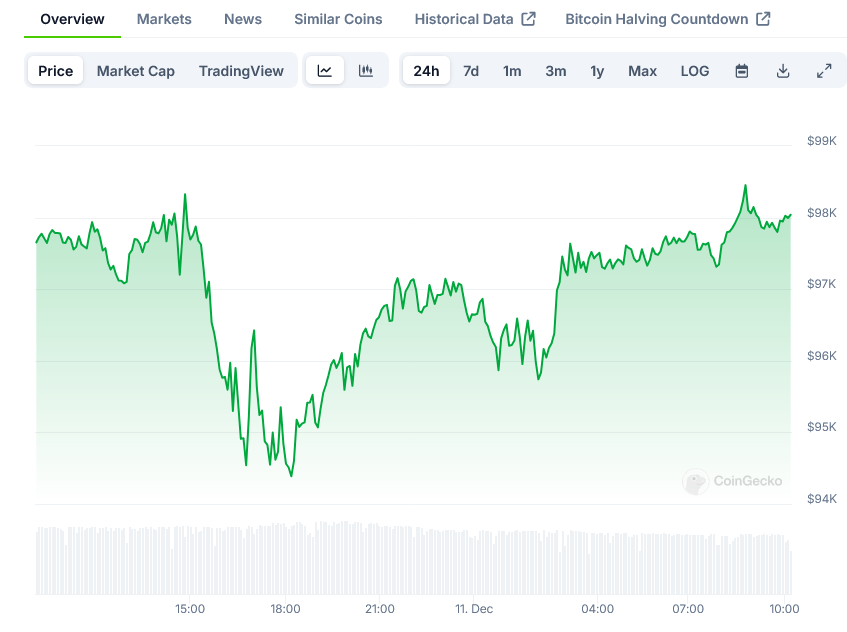 Bitcoin currently trading below $98,000 after briefly touching $100,000 on Dec 5th