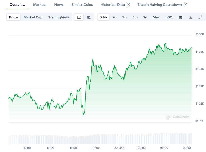 Bitcoin’s price currently stands at $105,031, maintaining its position above key support levels as market participants await further developments in both monetary policy and cryptocurrency regulation.