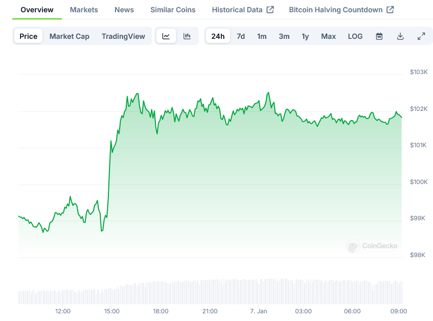 Bitcoin surpassed $102,000 on January 6, 2025, marking its first return to six-digit prices since December 19, with a 4.3% gain in 24 hours