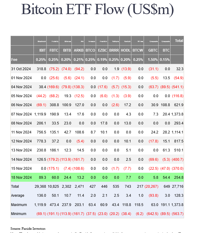 US Spot Bitcoin ETF saw $254.8M inflow on November 18