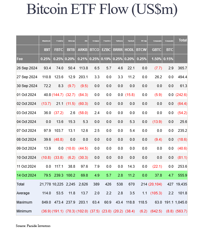 Bitcoin ETFs recorded $555.86 million in net inflows on Oct. 14, 2024