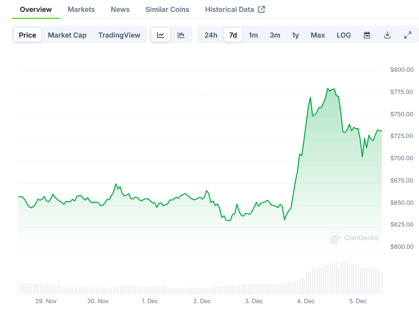 The surge follows the completion of an inverse head and shoulders pattern, a traditional bullish reversal formation that often precedes sustained upward moves. The pattern’s completion above the $680-$700 resistance zone marked the end of the previous downtrend.