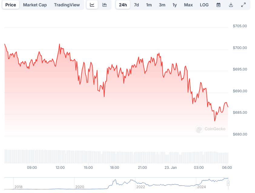 Short-term price movement indicates that BNB is approaching the 50% Fibonacci retracement level of the recent upward move from $664 to $703. This technical setup could provide insights into potential price direction in the coming days.