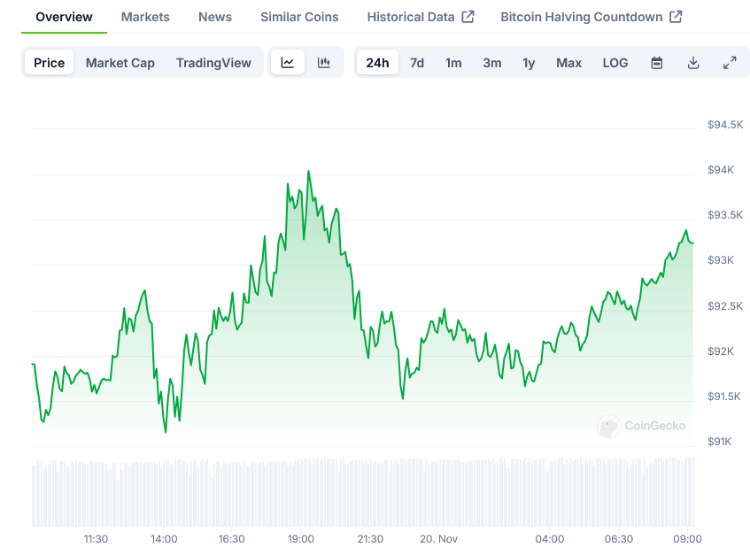 Trading data shows Bitcoin maintaining strong momentum above $92,000, with one-day trading volume holding steady at $74.75 billion.