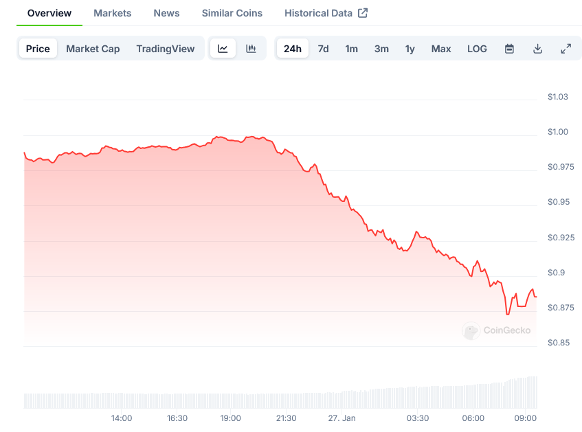Technical analysis reveals that a key bullish trend line, which had been providing support at $0.9750, was breached during the recent decline. This technical breakdown has led to additional selling pressure, pushing the price toward lower support levels.