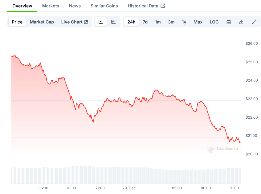 The cryptocurrency market has witnessed an unexpected shift as Chainlink (LINK) undergoes a notable price correction, dropping 15% from its recent highs. The digital asset, which had been riding high during December’s crypto rally, is now trading at $24.08, prompting renewed analysis of its short-term trajectory.