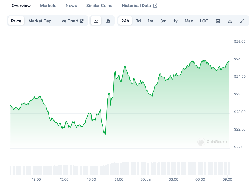 The digital asset is currently changing hands at $23.48, experiencing a decline of 1.89% over the past 24 hours and a more pronounced drop of 9.29% over the last week. Trading volume remains robust at $729.94 million, indicating active market participation despite recent price weakness.