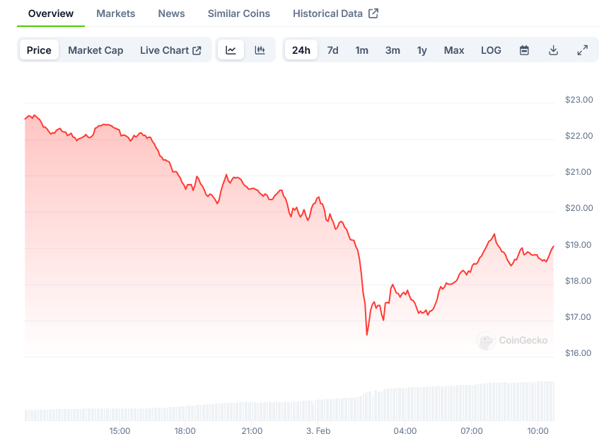 Currently trading at $22.37, with recent 9.1% daily and 11.4% weekly declines