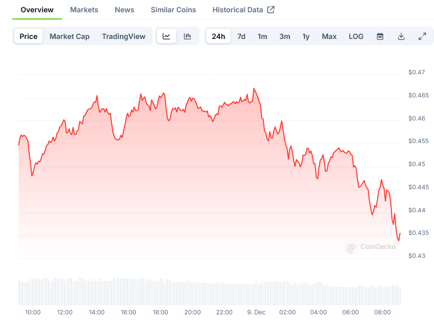 Dogecoin currently trading at $0.44, down 5.13% in 24 hours