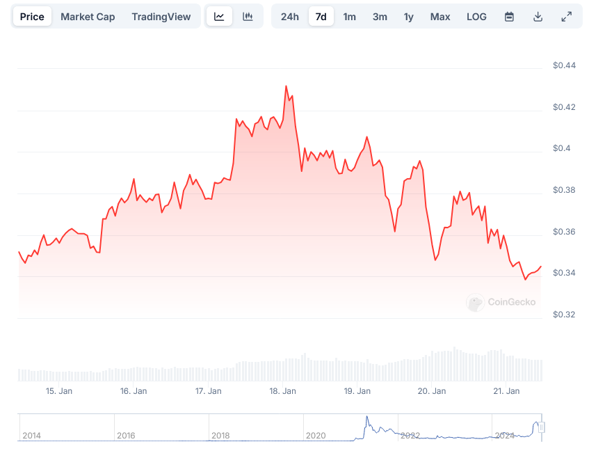 Traders are monitoring volume patterns and price action at key support and resistance zones. The 61.8% Fibonacci retracement level of the recent downward move from $0.3860 to $0.3380 has become a focal point for market participants.