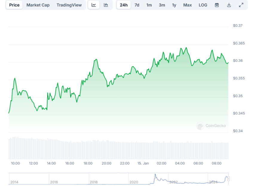 If the current price fails to break above $0.3650, analysts suggest the possibility of a retracement. In such a scenario, the price might test lower support levels, potentially reaching $0.3120 or even $0.3080 in the near term.