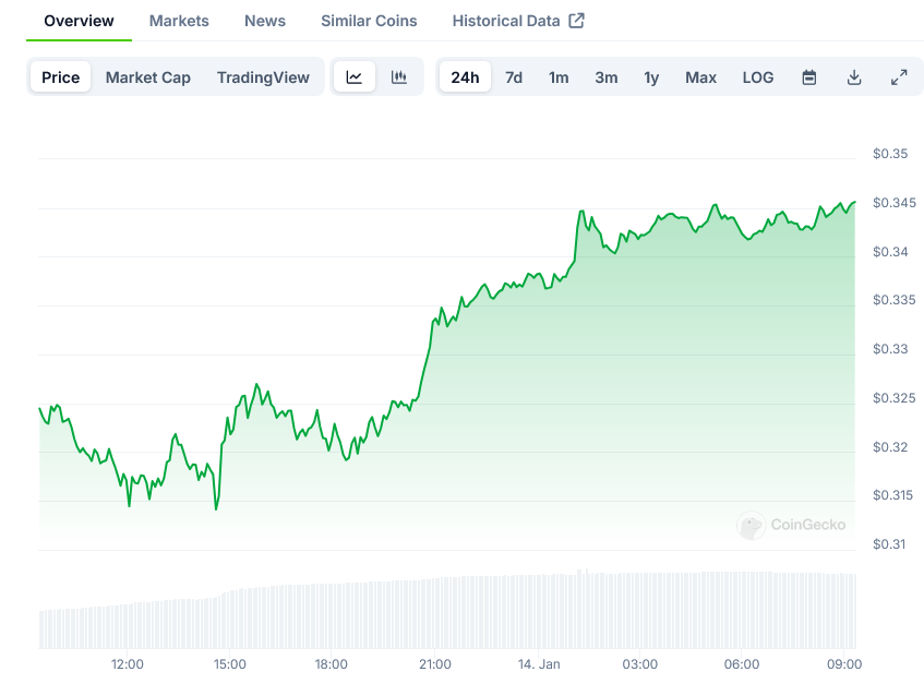 The popular memecoin is currently trading at $0.318, marking a 6.5% decline over the past 24 hours. However, trading volume has surged by 60% during this period, indicating heightened market participation as the price tests key support levels.