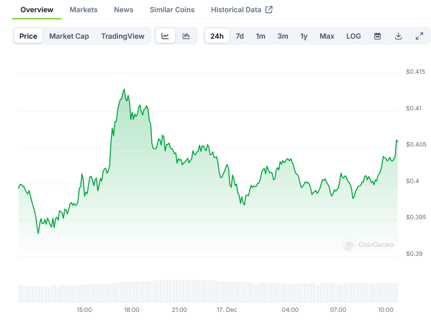 Technical analysis reveals that the price has successfully reclaimed ground above the 23.6% Fibonacci retracement level, calculated from the recent swing high of $0.4136 to the low of $0.3963. This recovery suggests that buyers remain active in the market despite the recent selling pressure.
