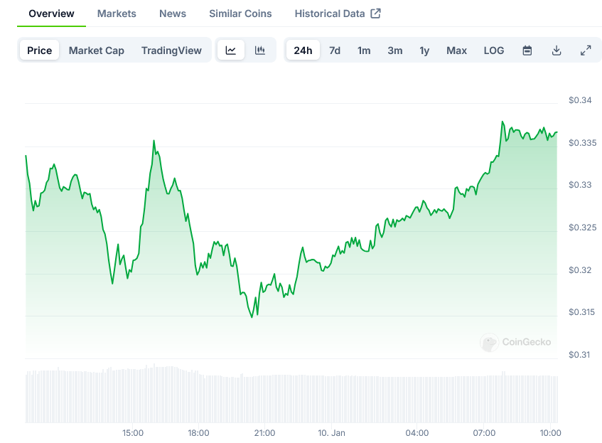 The price action has created several key levels that traders are watching closely. The immediate resistance zone between $0.3350 and $0.3400 has proven to be a challenging barrier for buyers, while the support area near $0.320 has absorbed selling pressure so far.