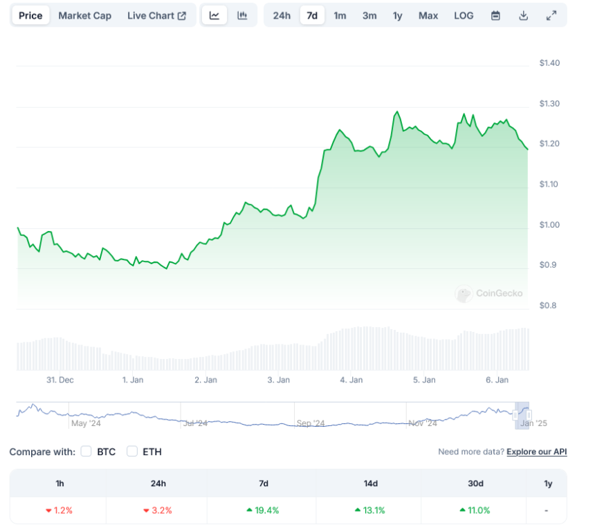Technical analysis reveals that ENA is currently trading within a cup and handle pattern, a formation typically associated with bullish market movements. This pattern suggests a potential upward trajectory, with analysts identifying $1.32 as a crucial resistance level that needs to be cleared for continued momentum.