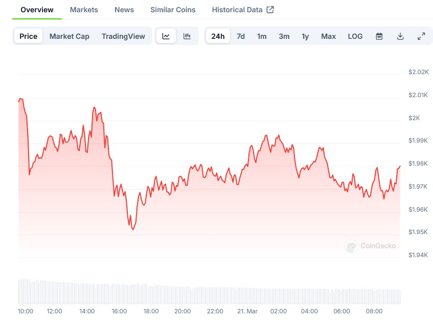 ETH price is down 26-47% in the past month, currently trading around $1,970-$1,990