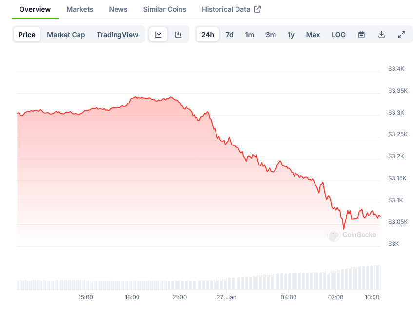 Ethereum’s price performance in January 2025 has diverged from broader market trends, recording a 6.7% decline since the start of the month. The second-largest cryptocurrency by market capitalization opened the year at $3,400 but has since retreated to $3,170 as of January 27, according to data from CoinGecko.