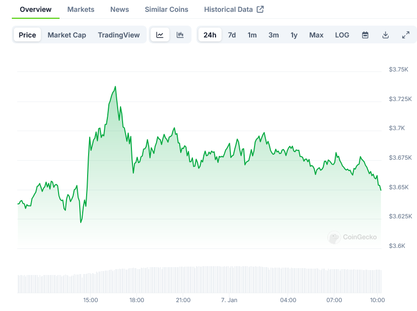 Ethereum has surged past $3,670, marking its fourth approach toward the stubborn $4,000 resistance level in 2024. The second-largest cryptocurrency by market capitalization currently trades at $3,696, showing a 1.9% increase over the past 24 hours.