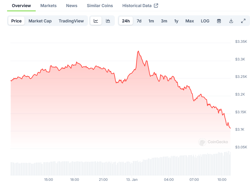 If support at $3,220 breaks, ETH could test lower levels at $3,160 and potentially $3,050