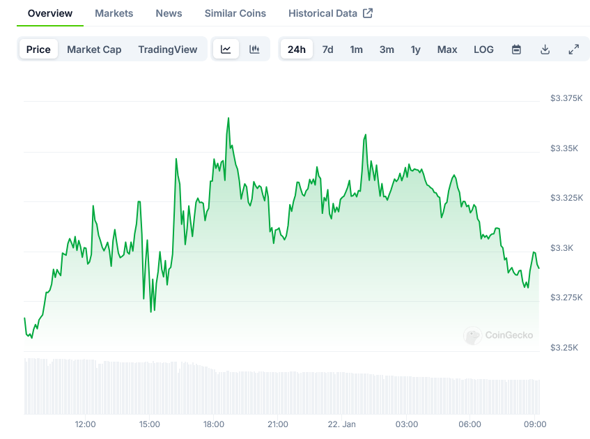 The current price of $3,279 represents a slight decline of 0.87% from the daily high of $3,366. However, trading patterns indicate steady buying pressure at these levels, particularly from addresses holding substantial ETH positions.