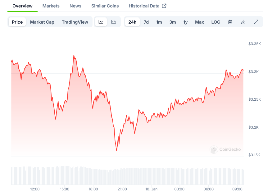 Current ETH price stands at $3,292.60 as of January 10, 2025, showing a -0.65% daily change