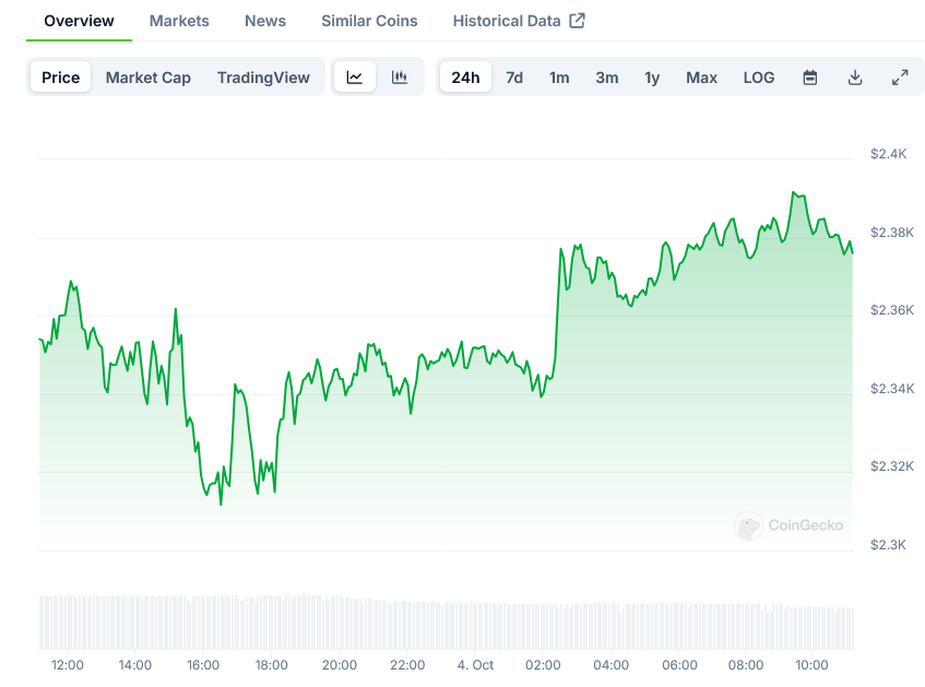 ETH price dropped 4.5% in 24 hours, trading around $2,346