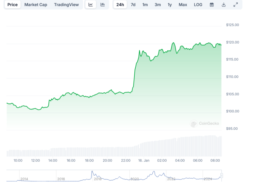CoinGecko data shows that LTC soared around 13% following Canary’s move to update its Litecoin ETF filing. The cryptocurrency now trades at around $118, up 16% in the last 24 hours. Over the same period, its trading volumes reached $1.6 billion.