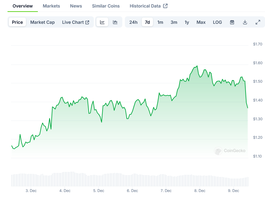 Current price stands at $1.50 with a recent 13% surge over 7 days