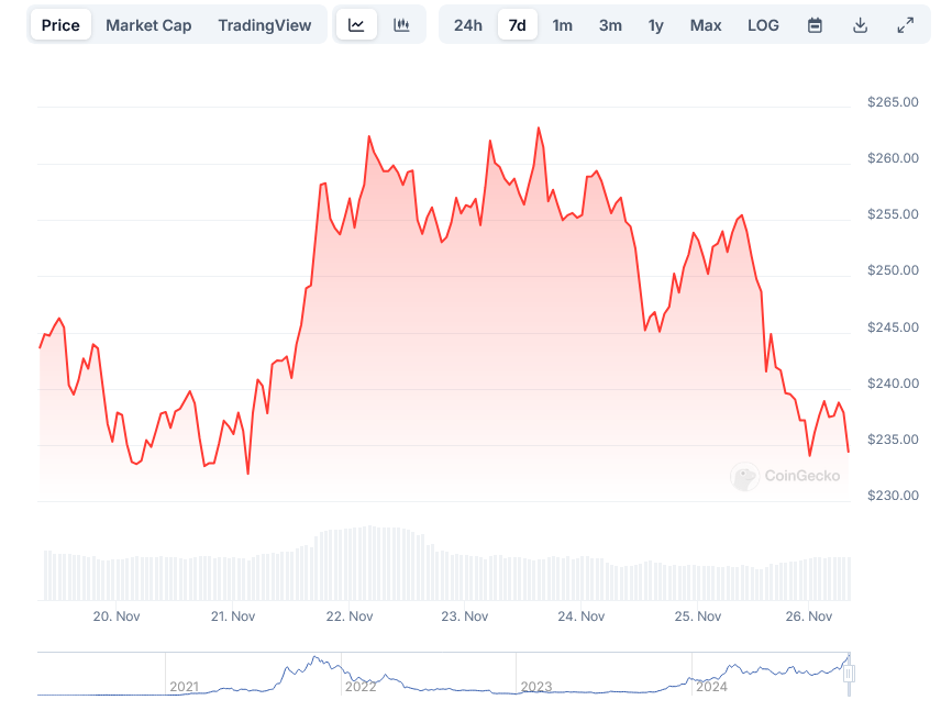 Market forecasts suggest continued upward movement, with predictions of an 8.70% increase to $275 by December 25, 2024. However, these projections come amid broader market volatility.