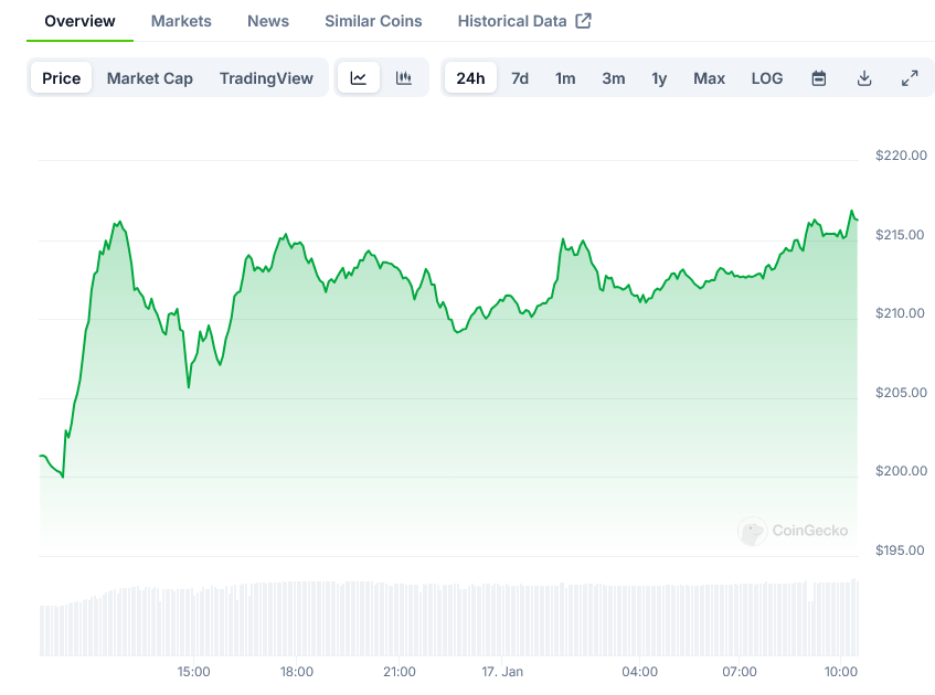 Technical analysis of Solana’s performance shows strong momentum. Recent trading data indicates an 8% increase over the past 24 hours, with the price settling at $214.86. This upward movement continues the trend of recovery seen throughout 2024.