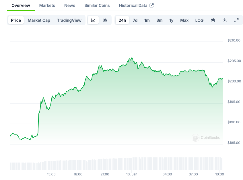 Solana demonstrated renewed market strength today as its price surged above the $200 mark, establishing fresh support levels in its upward trajectory. The move comes as part of a broader market rally that has seen the cryptocurrency break through several key resistance levels.