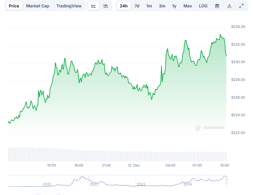 Technical indicators suggest potential upward movement for SOL price. The Relative Strength Index shows an upward reversal after approaching oversold conditions, while the Donchian Channels indicator identifies $233 as a key resistance level to watch.
