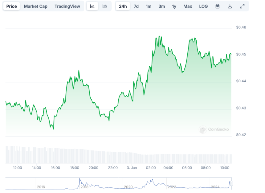 Price analysis suggests that if XLM maintains its current trajectory, it could target its November 24, 2024 high of $0.63, representing a potential 40% gain from current levels. The immediate resistance level stands at $0.47, with $0.50 serving as the next key target.