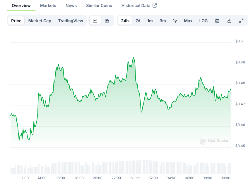 Technical analysis shows a double bottom pattern formation on the 4-hour chart, with the next price target predicted at $0.52 based on Fibonacci extension levels