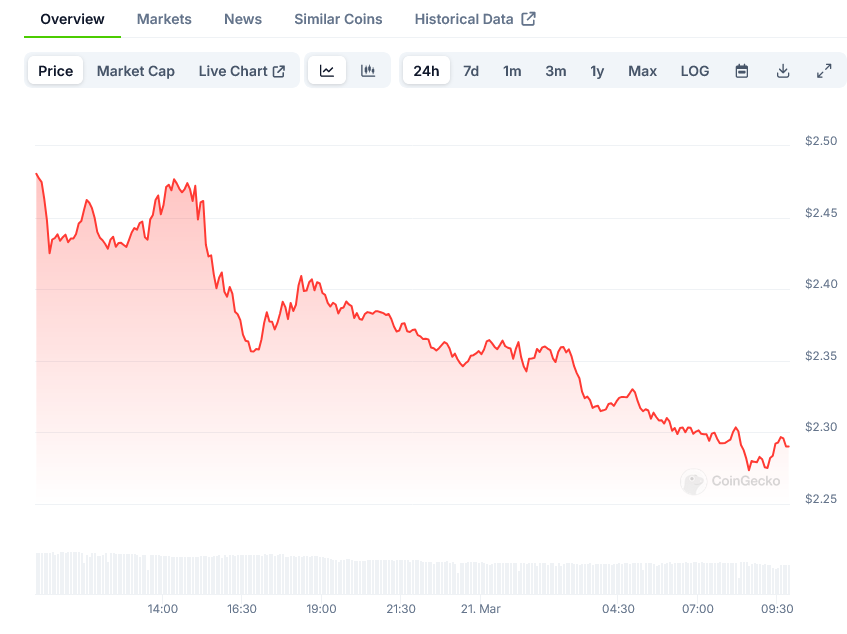 However, caution is warranted as a drop below $2.2 would invalidate the bullish setup. Such a move could trigger a deeper correction toward $2 or lower, with $1.48 (0.786 Fibonacci) acting as the last major support.