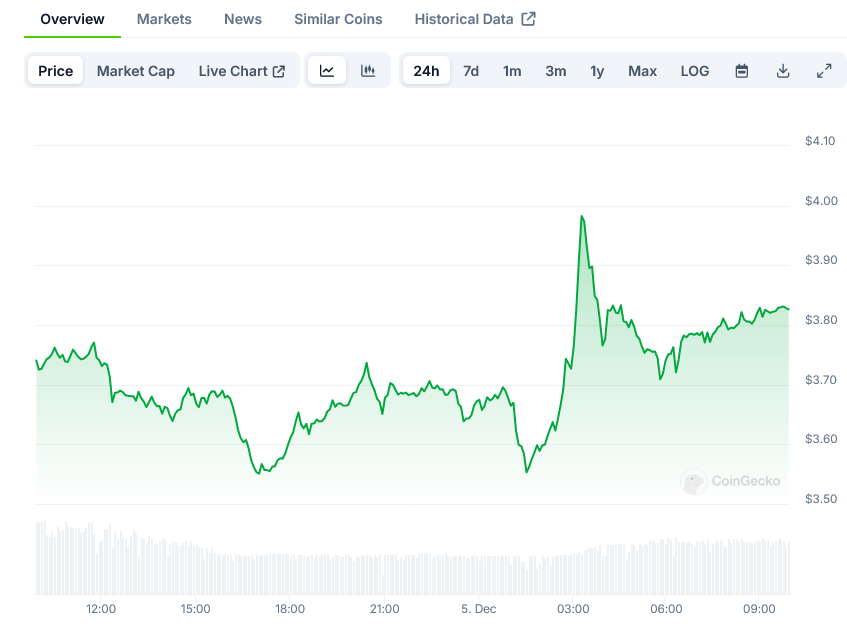 Liquidation data reveals important price levels that could influence future price action. A substantial cluster of liquidation orders exists at the $4.00 price point, with another notable concentration at $3.17, positioning these levels as potential targets for price movement in both directions.