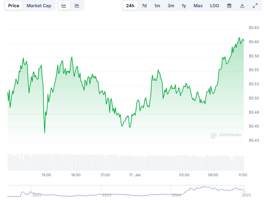 Toncoin (TON) maintains its position above $5.50 in January 2025, demonstrating price stability despite recent market fluctuations. The cryptocurrency, which has gained attention for its role as a Layer-1 blockchain solution, currently trades at $5.22, marking a modest 0.5% increase over the past 24 hours.