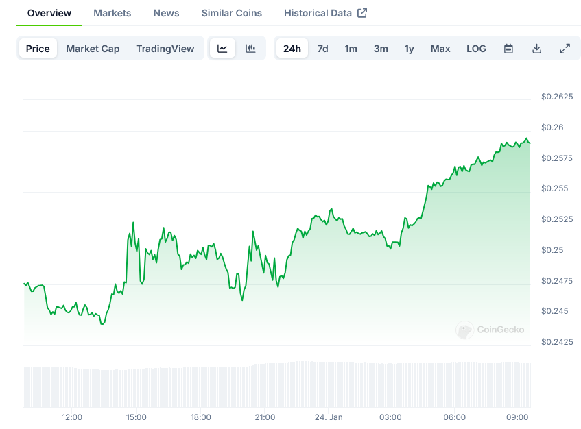 Despite these impressive network metrics, the price of TRX, TRON’s native cryptocurrency, has maintained a sideways trading pattern between $0.22 and $0.27 since the start of the year. This follows a notable rally in the fourth quarter of 2024, which saw the token reach $0.44 before experiencing a correction during the holiday season.