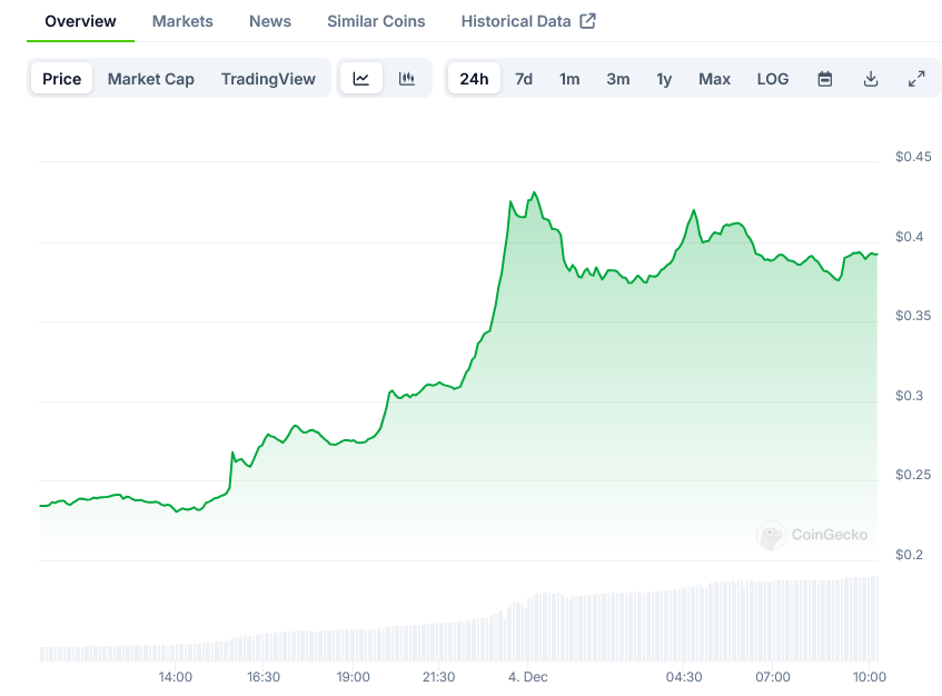 Tron’s native token TRX has achieved a historic milestone, reaching an all-time high above $0.43 on Tuesday. The price surge represents an 81% increase, pushing the project’s market capitalization beyond $35.1 billion, according to data from CoinGecko.