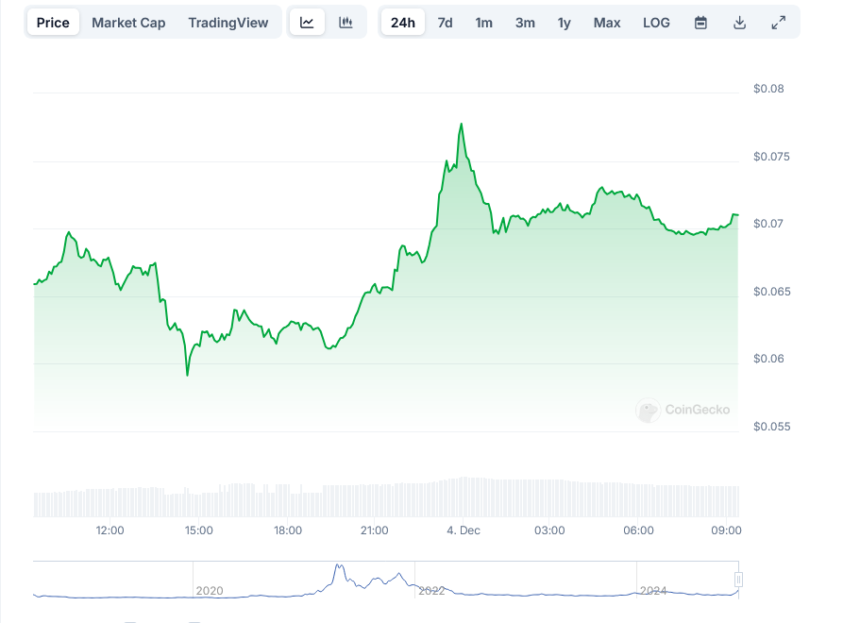 VeChain’s native token VET has reached a notable milestone, touching $0.0726 in December 2024, marking its highest price point in two years. The digital asset has demonstrated remarkable growth, recording gains of 9.1% in the last 24 hours and an impressive 265.5% increase over the previous month.