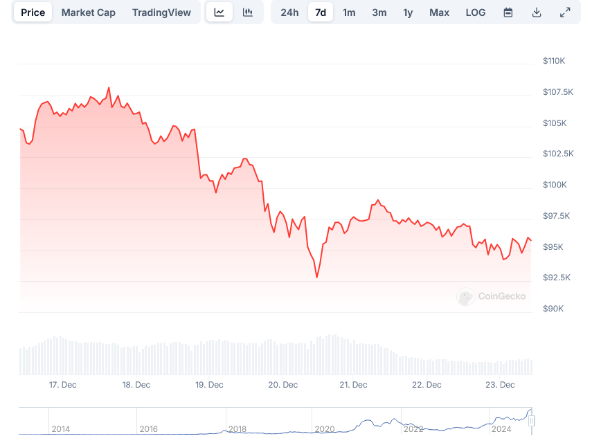 Bitcoin experienced its first major weekly price decline since Donald Trump’s November election victory, dropping 10% to close at $94,645 for the week ending December 22, 2024. The decrease marked a stark contrast to the cryptocurrency’s recent bullish trend that had pushed it above $100,000.