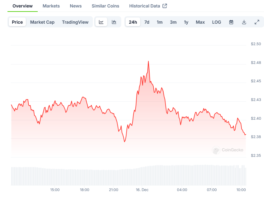 The price action began with a decisive move above the $2.35 zone, pushing through several resistance levels to reach new local highs. This upward trajectory mirrors similar movements seen in other major cryptocurrencies, including Bitcoin and Ethereum, indicating broader market strength.