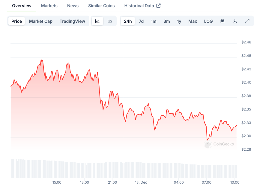 The price action began showing positive momentum after breaking above the $2.25 level, outperforming major cryptocurrencies including Bitcoin and Ethereum. This move was followed by successful tests of the $2.32 and $2.40 resistance levels, which have now turned into support zones.
