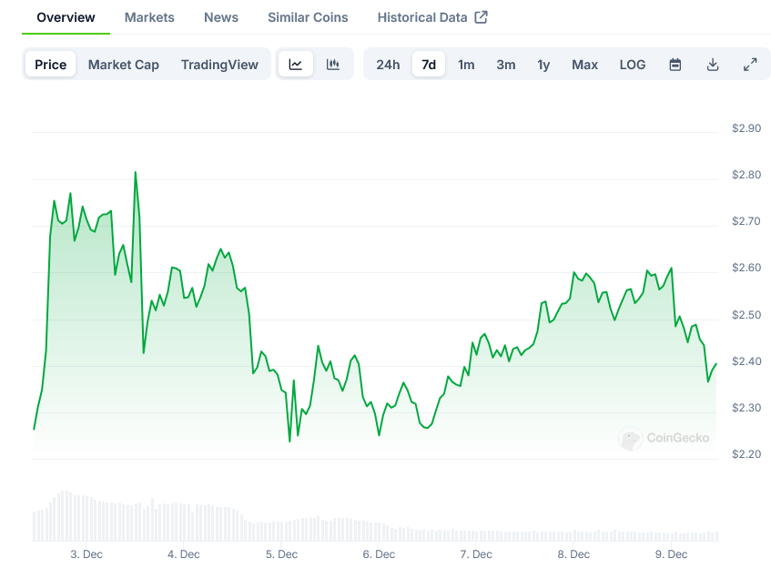 Market analysts have identified potential price targets based on current market structure. Technical indicators suggest the possibility of movement toward the $3.00 level, with some pointing to the 2021 cycle top of $3.30 as a longer-term target.